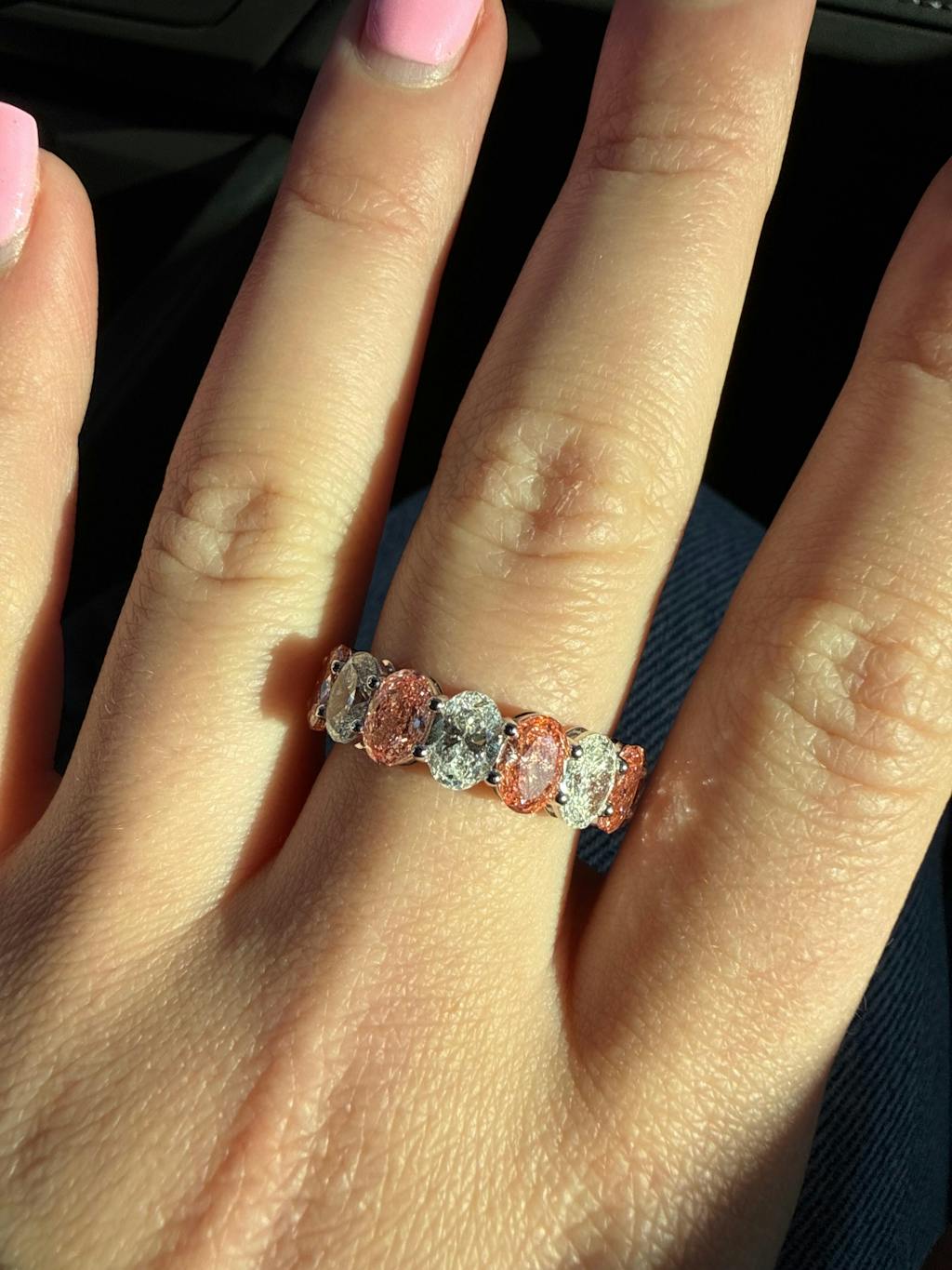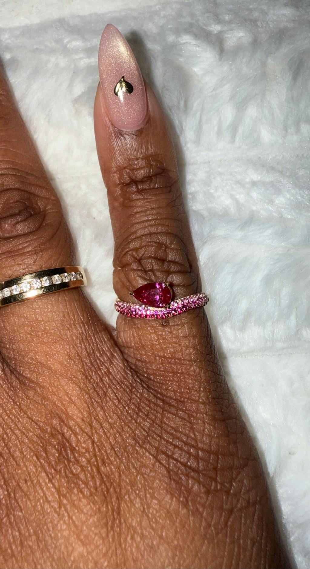 She has arrived in all of her pink sparkly glory! Interestingly; depending on how the light hits her, she has a purple sparkly hue to her which I absolutely love! She was a little lighter and daintier, in terms of weight, nonetheless I’m extremely happy with her and she adds the perfect amount of color to my stack! 💖✨💕 I also appreciated the communication and request for and a size adjustment which they were able to accommodate! I’m eyeing a few loose gems and constantly checking socials for new ones as I will be returning for a more custom piece! 💗
